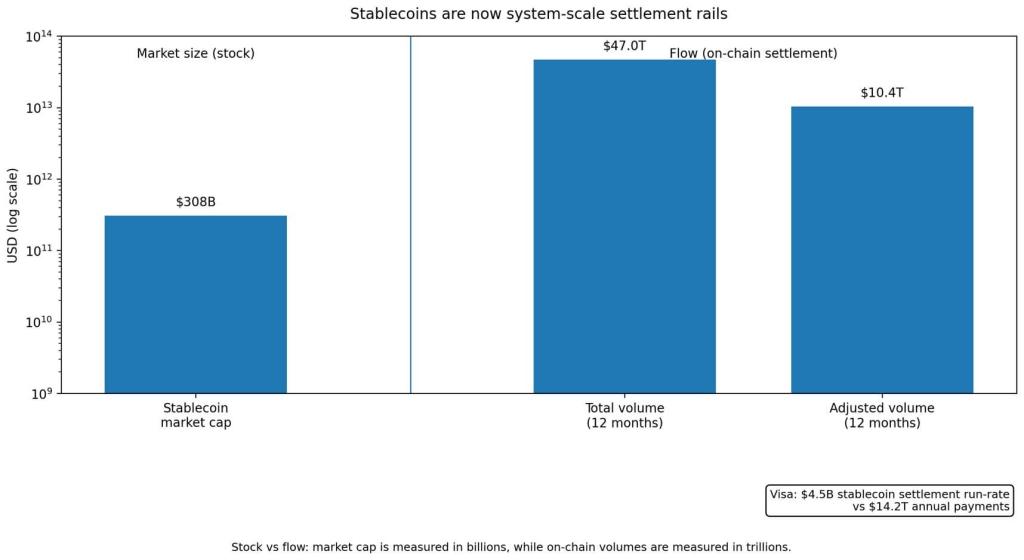 The numbers support the urgency. Stablecoins are now a $308 billion market, while on-chain settlement activity has reached scale: Visa and Allium cite $47 trillion in total stablecoin transaction volume over the past year, with $10.4 trillion after removing outliers.